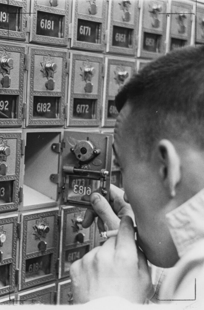These combination lock mailboxes were state of the art when they were installed in the post office branch in Johnstone Hall in 1955. The post office operated in Johnstone Hall from 1955–2023.